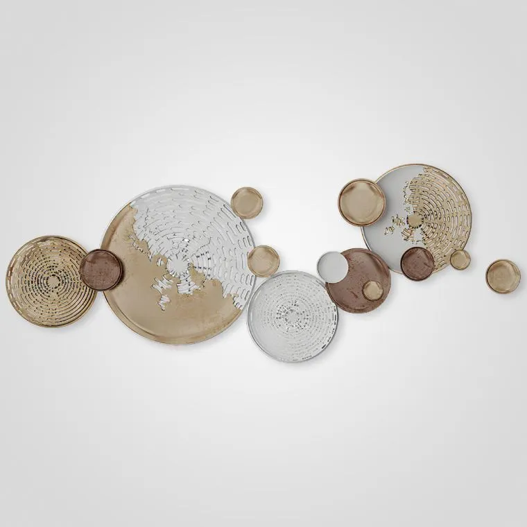 Настенный декор из металла в виде ассиметричной композиции из круглых элементов - гладких и ажурных дисков с радиальными узорами