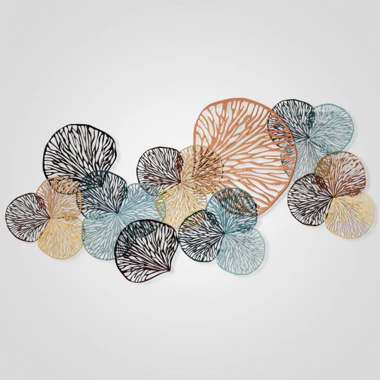 Элегантный настенный декор в виде абстрактной композиции из металлических дисков различных размеров с ажурным узором