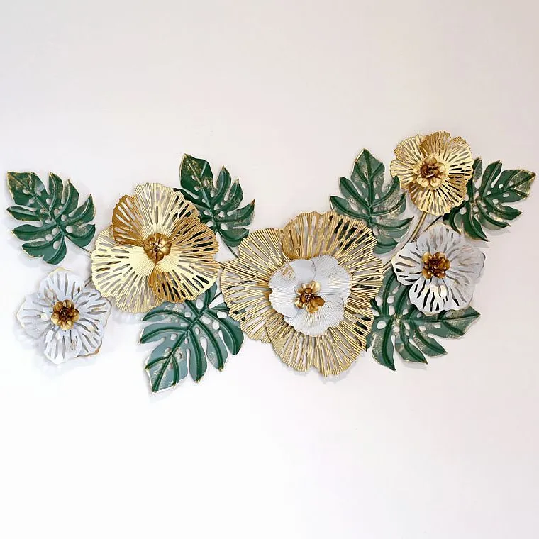 Изысканный металлический настенный декор в виде цветочной композиции с крупными золотыми и белыми цветами с рельефными лепестками, дополненными зелеными тропическими листьями монстеры