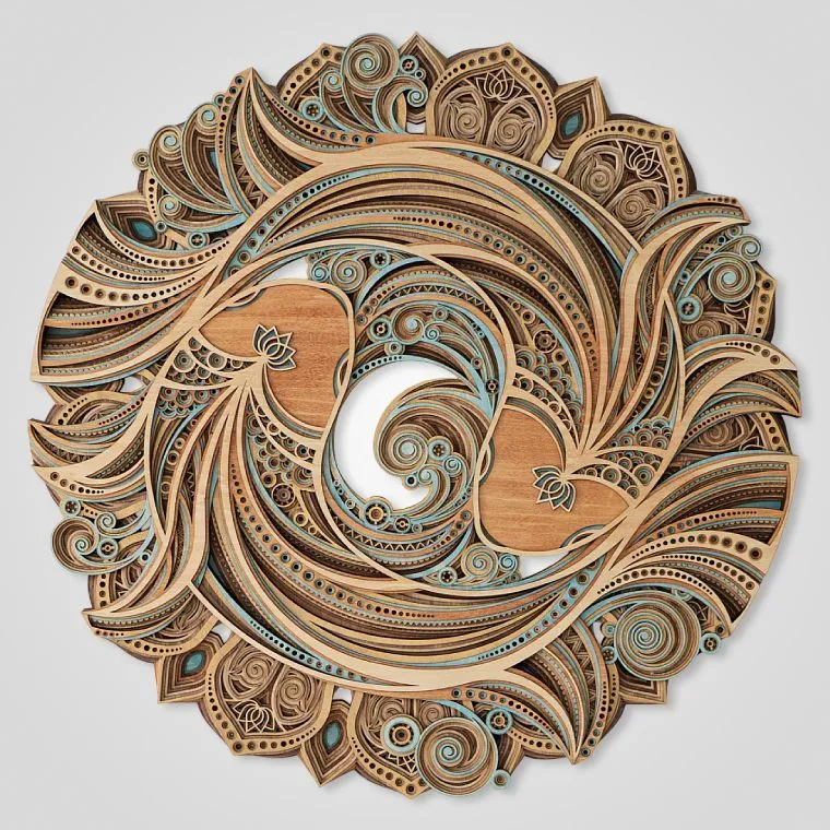 Настенный декор из дерева выполнен в виде ажурного круглого орнамента с плавными волнистыми линиями, изящными узорами и резными деталями, дополненными акцентами голубоватого оттенка