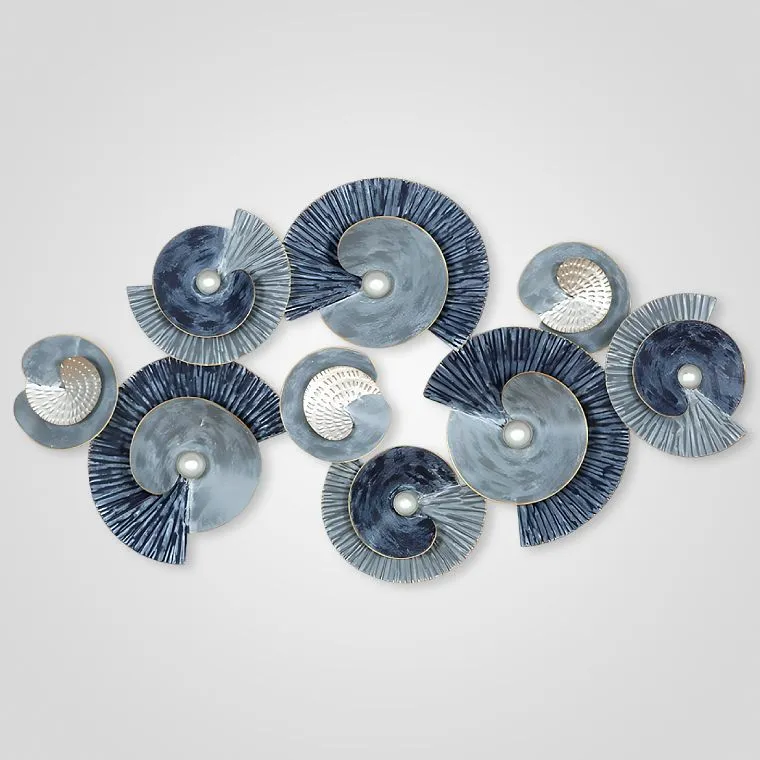 Настенный декор из металла в виде абстрактных раковин с текстурированными элементами и жемчужными акцентами, выполненный в элегантной кобальтовой гамме