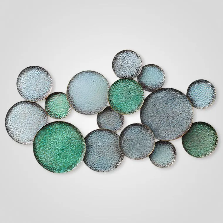 Настенный декор из металла в форме композиции из круглых элементов разного размера с текстурированной поверхностью, выполненный в зеленых и голубых тонах