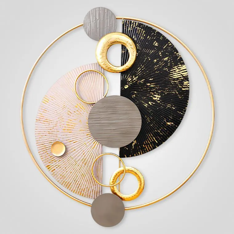 Настенное металлическое панно в виде круга с абстрактной композицией из полукругов, текстурных дисков и колец, гармонично сочетающих черные, серые и золотые оттенки, создавая современный и динамичный визуальный эффект