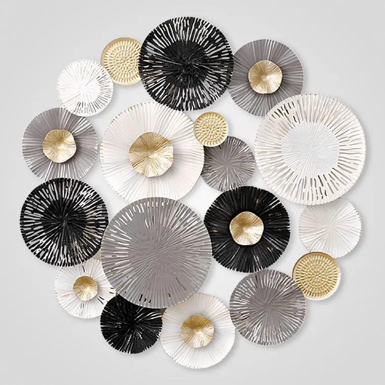 Элегантное настенное панно из металла в виде композиции из текстурированных дисков разного размера в монохромной гамме черного, белого и серого цветов с золотыми акцентами, создающее эффект объемной абстрактной инсталляции с радиальным рисунком