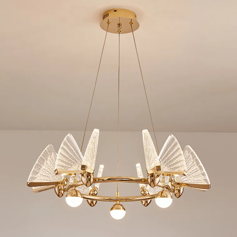 Особенностью данной модели является форма плафонов в виде кольца и бабочки с прозрачными или разноцветными крыльями. Люстры представлены в золотом цвете каркаса. Благодаря материалу изготовления – металлу и акрилу – эти люстры отличаются прочностью и долговечностью.