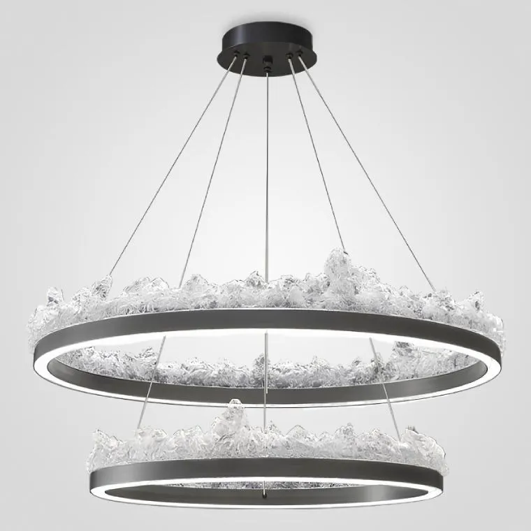Вместе с тем, два размера – 60 и 80 см – позволяют адаптировать люстру под любое пространство, а каскадная версия из двух колец (60 и 80 см) дарит возможность создать многослойное и динамичное освещение. Намеренно направленный вверх рассеиватель из полимера, выполненный в виде льда, обеспечивает мягкое и уютное свечение, создавая неповторимую атмосферу.