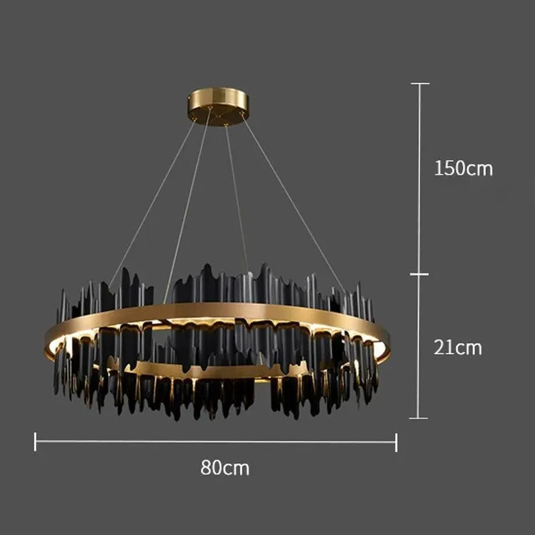 Все изогнутые рассеиватели «Flame Wave» выполнены из латуни, что придает им благородный вид и добавляет шарма всей конструкции. Черный корпус и струнный подвес усиливают эффект элегантности и современности, делая эти люстры идеальным решением для гостиной или кухни.