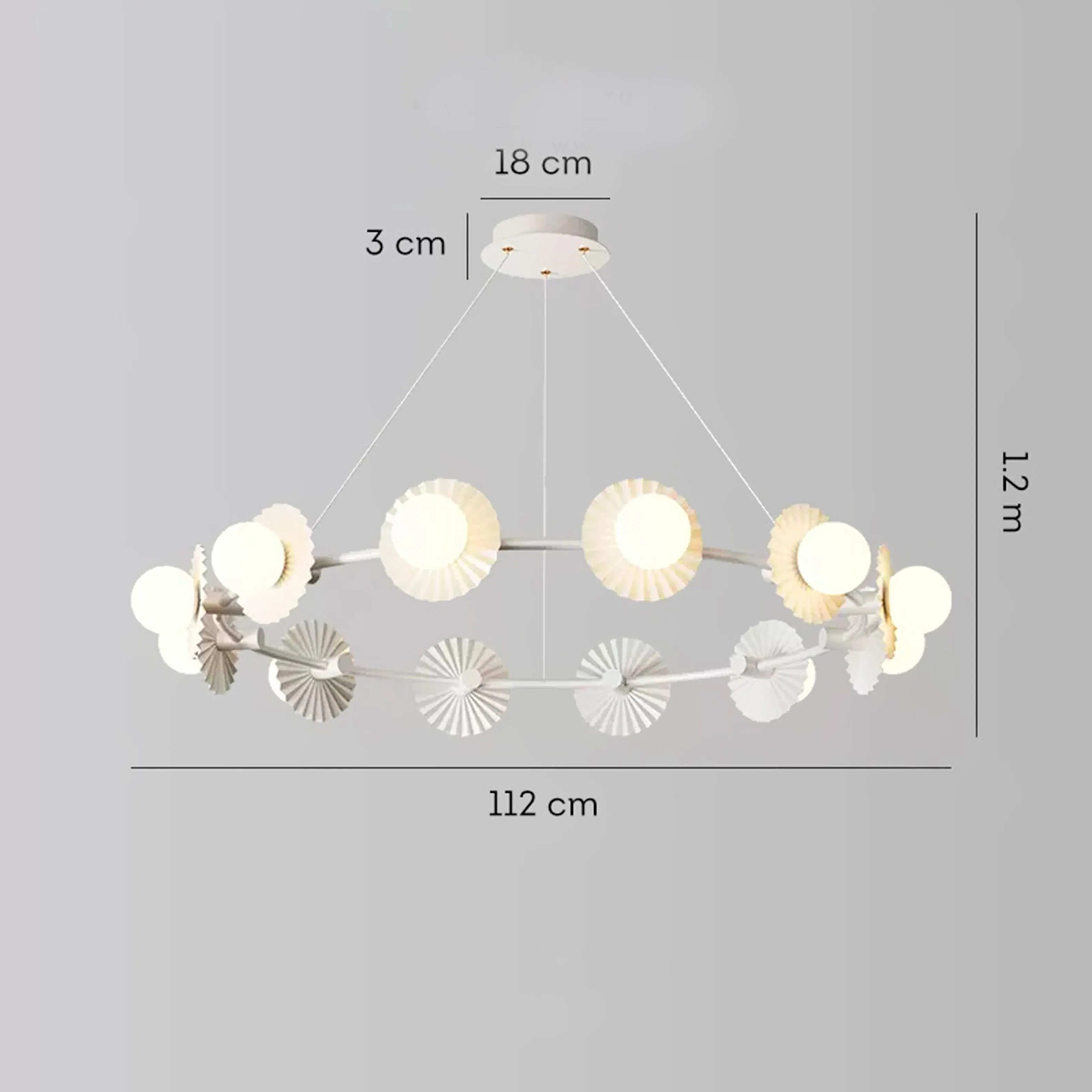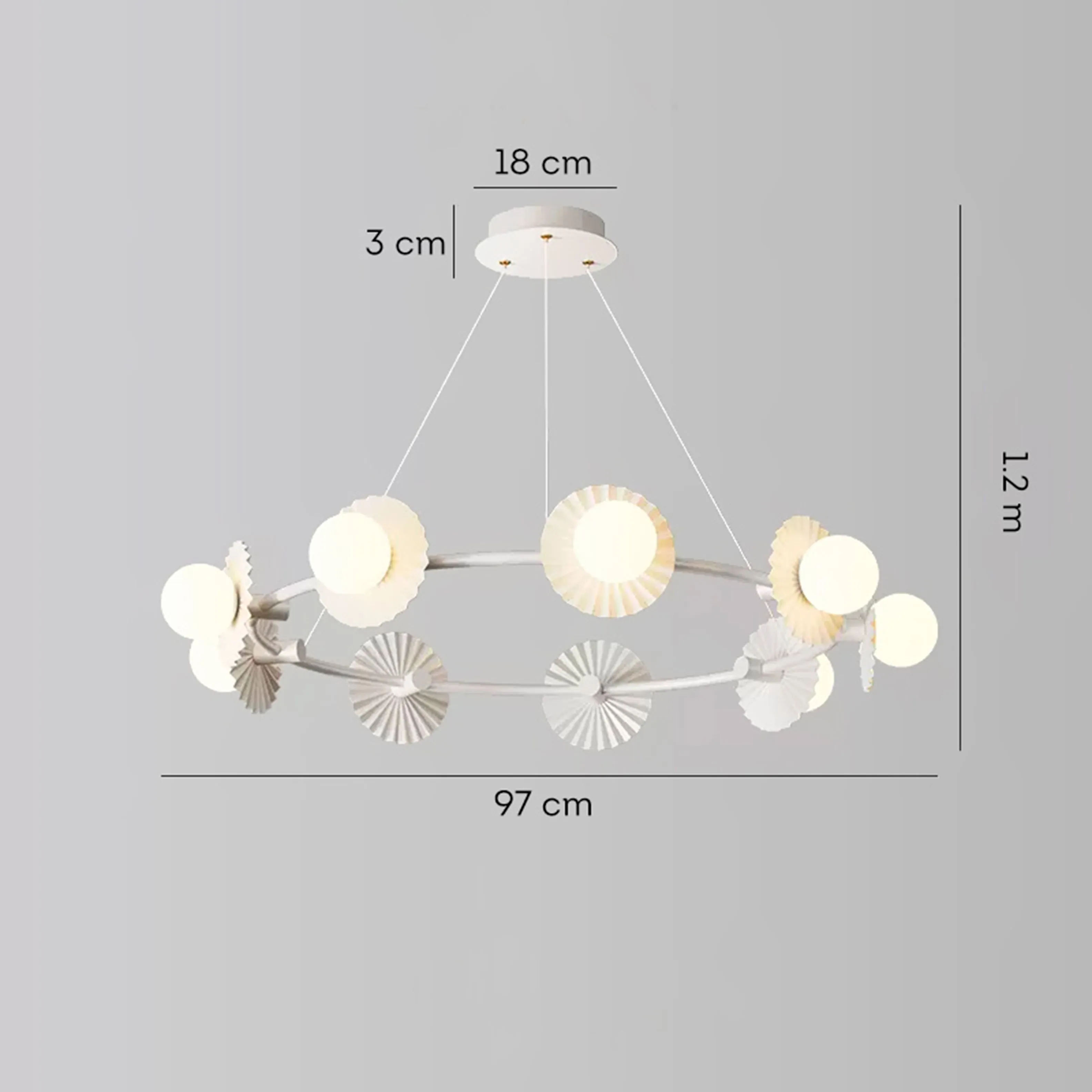 Все люстры оснащены светодиодными лампами, которые обеспечивают долгий срок службы, низкое энергопотребление и яркий свет. варианты светильника на 6 ламп (размер - Ø 68 × 15 см, размер потолочного крепления - Ø 15 × 3 см), на 9 ламп (размер - Ø 97 × 15 см, размер потолочного крепления - Ø 18 × 3 см), на 12 ламп (размер - Ø 112 × 15 см, размер потолочного крепления - Ø 18 × 3 см), длина подвеса - 120 см, что дает возможность регулировать высоту люстры и создавать комфортное освещение в помещении.