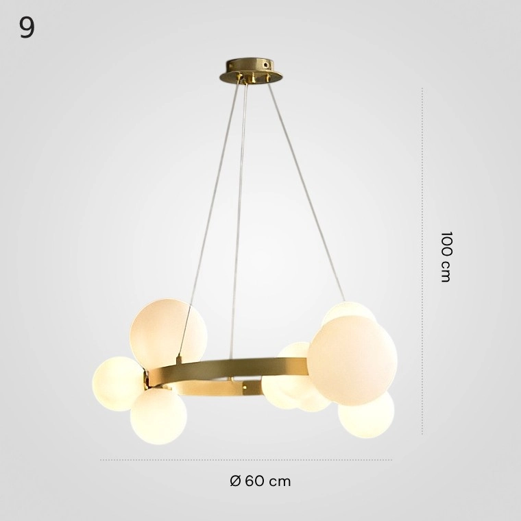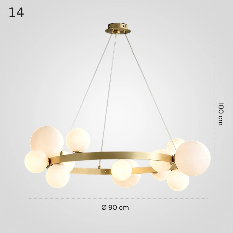 Серия люстр с плафонами из мрамора разного размера, расположенными ассиметрично на кольцевом каркасе из металла