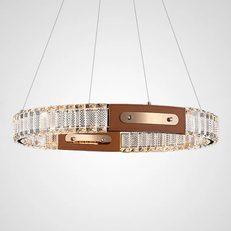 Серия кольцевых светодиодных люстр с рельефными хрустальными рассеивателями и отделкой из натуральной кожи