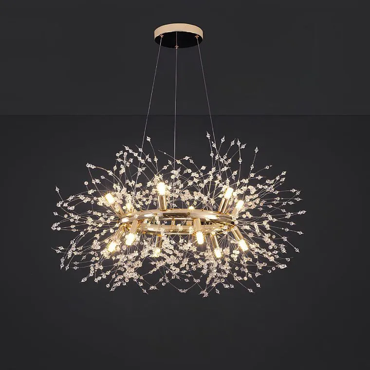 Представьте себе вечер, наполненный мягким светом, который словно нежный шепот окружает вас, создавая атмосферу уюта и изысканности. В центре этого света кольцевая люстра, словно облако из золотых нитей, увенчанное искрящимися пучками хрустальных бусин. Они играют с лучами света, рассыпая по комнате завораживающие искры, как капли росы на утреннем солнце. Нежные "брызги" хрусталя напоминают капли дождя, скользящие по листьям, или звезды, рассыпанные по небосклону.