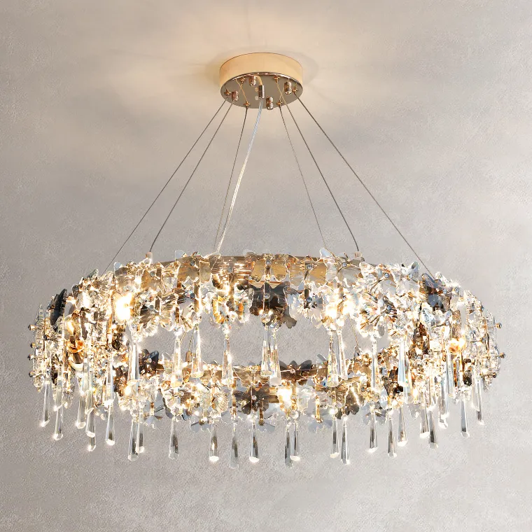 Серия кольцевых люстр с хрустальными рассеивателями в виде бабочек с каплевидными подвесками