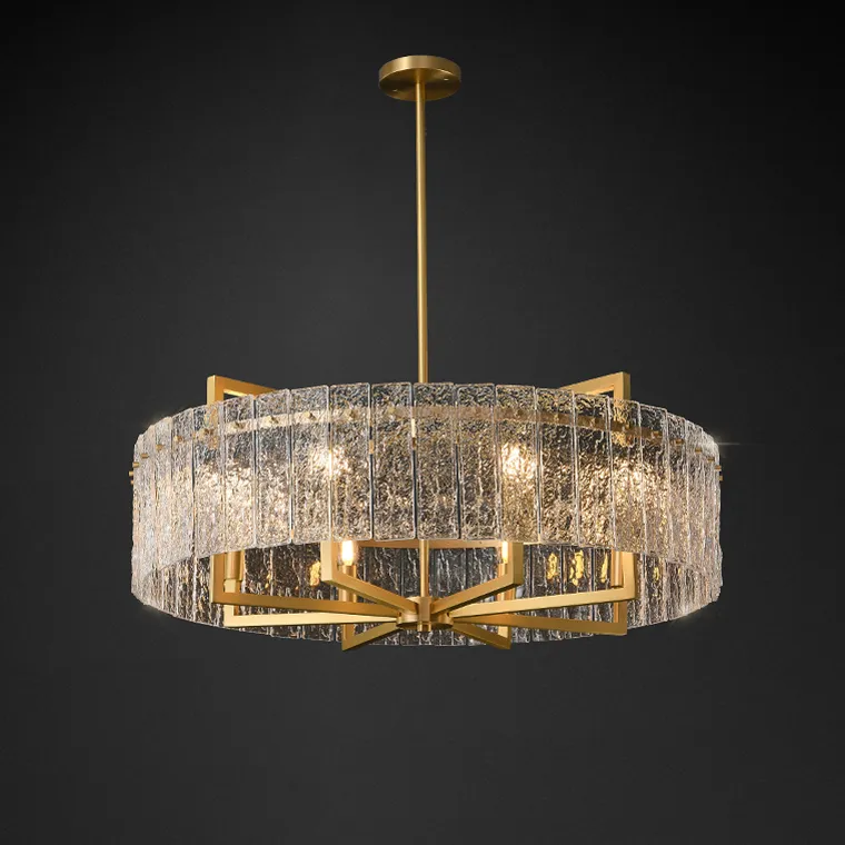 Серия люстр на лучевом каркасе с кольцевым абажуром из рельефных стеклянных пластин прямоугольной формы