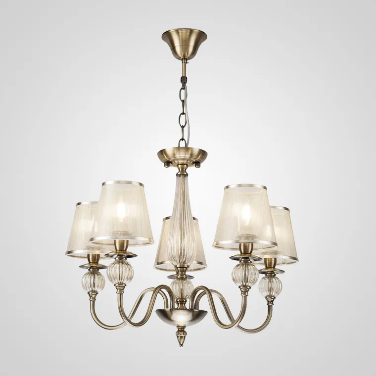 Подвесная люстра с конусными плафонами из органзы и корпусом декорированным вставками из рифленого стекла Люстру можно использовать как потолочную версию