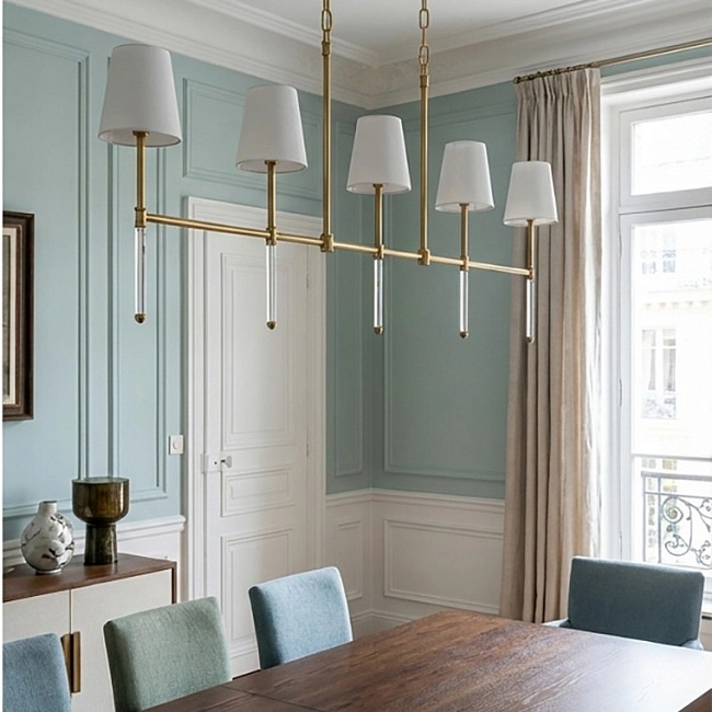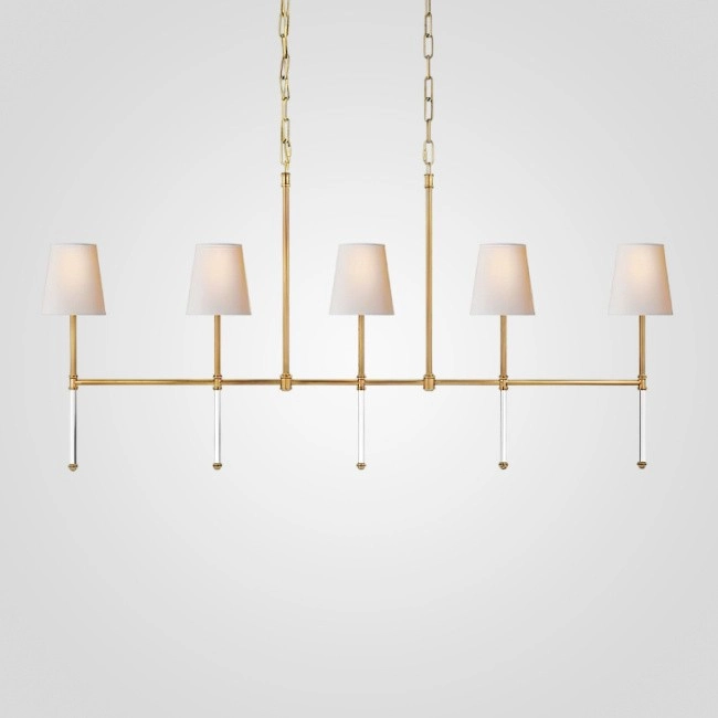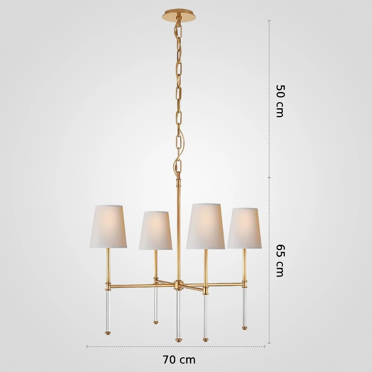 Подвесная люстра с коническими текстильными абажурами на сборных стойках из хрусталя и латуни