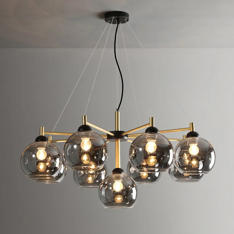 Люстра ETNA оснащена цоколем E27, что позволяет использовать различные варианты ламп. Вы можете выбрать люстру с янтарными или дымчато-серыми плафонами, а также определиться с количеством плафонов: 5, 7 или 9.
