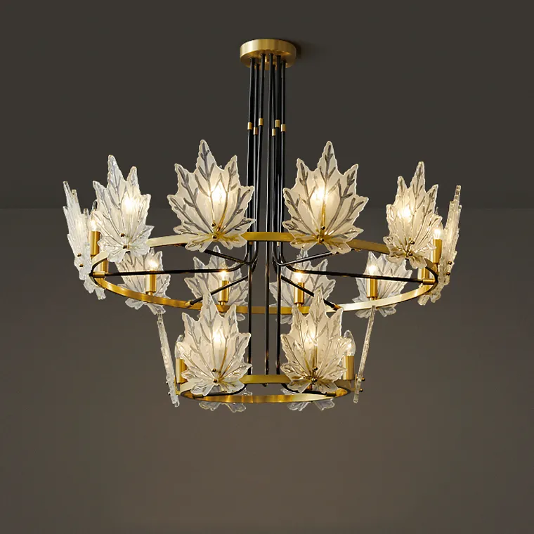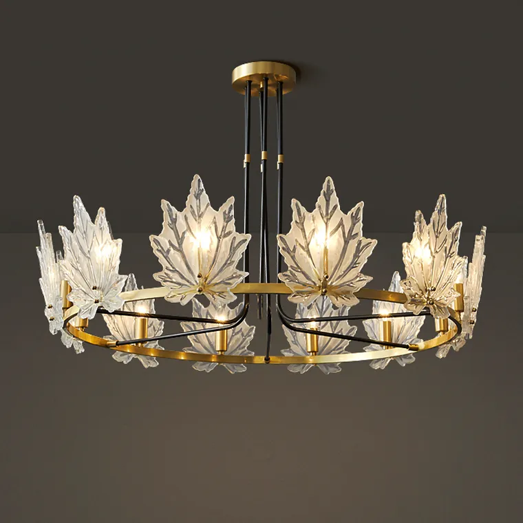 Дизайнерская серия люстр Karanda с прозрачными стеклянными плафонами в виде кленовых листов на кольцевом каркасе станет ярким акцентом в любом интерьере. У нас доступны модели с различным количеством ламп - 6 (размер Ø 55×65 см), 9 (Ø 80×65 см), 12 (Ø 100×65 см) и 18 (Ø 100×95 см).