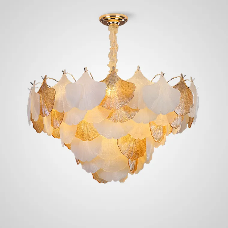 Каскадная люстра с белыми и янтарными рассеивателями из матового стекла с природными мотивами