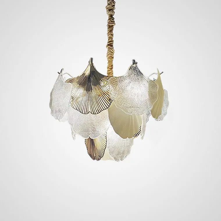 Этот нежный листопад сияет прекрасными оттенками, отображая красоту природы в самом изысканном виде. Узоры листьев гинкго, созданные из матового и прозрачного стекла, и металлических подвесок, образуют абажур многоярусной конструкции, которая наполняет пространство светом и атмосферой таинственности.