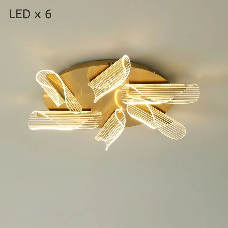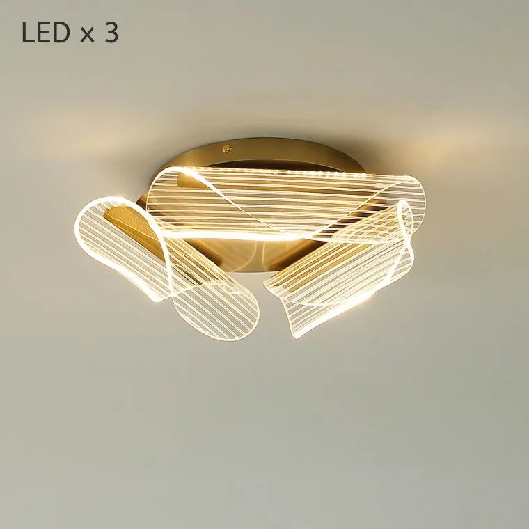 Серия потолочных светодиодных люстр с прозрачными плафонами в виде свернутых пластин с линейной гравировкой.