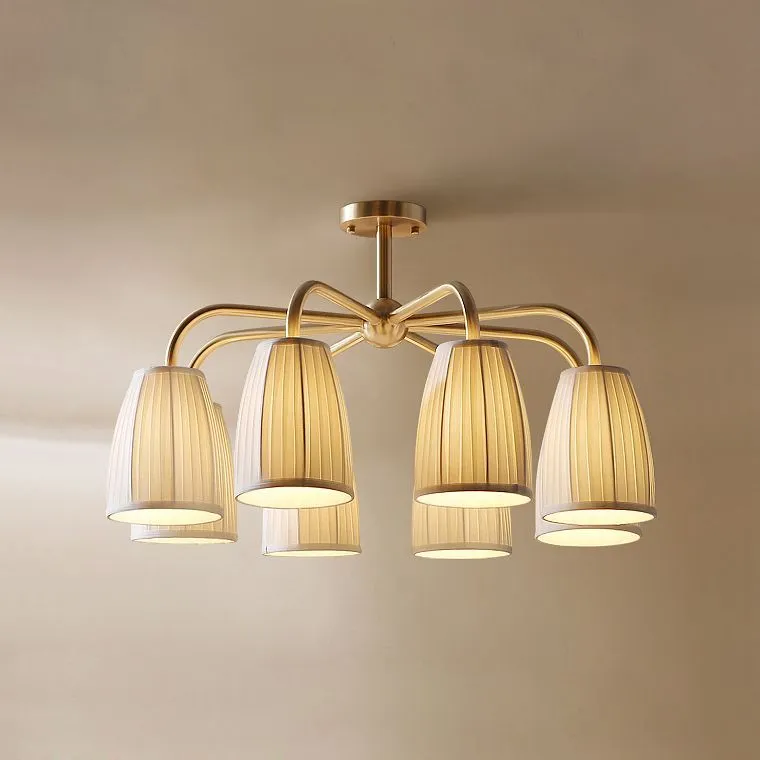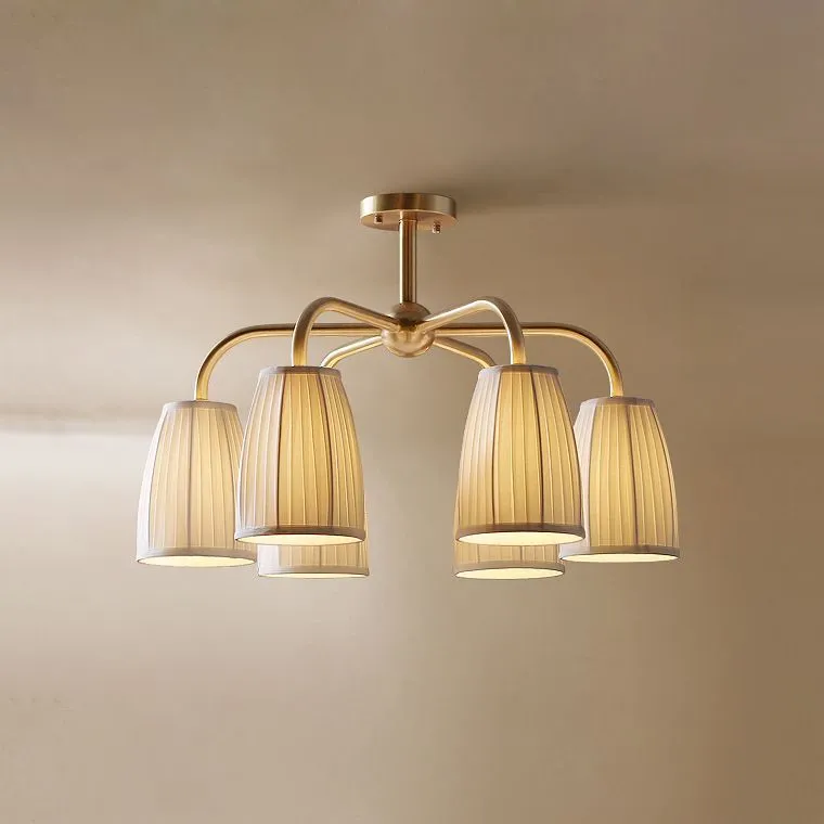Представьте себе элегантную потолочную люстру в американском стиле, которая идеально впишется в вашу спальню или гостиную с низкими потолками. Ее прекрасный латунный каркас добавит нотку роскоши и изыска, а белые плафоны в виде конусов, направленные вниз, создадут уютный и интимный свет.