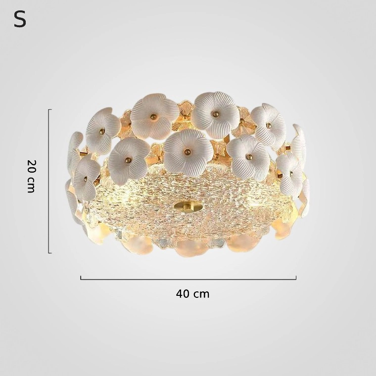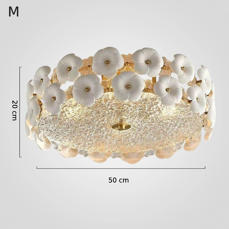 Серия потолочных люстр в виде композиции из белых керамических цветов с золотыми акцентами и фактурного стекла с эффектом льда