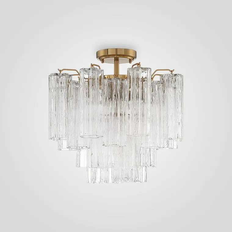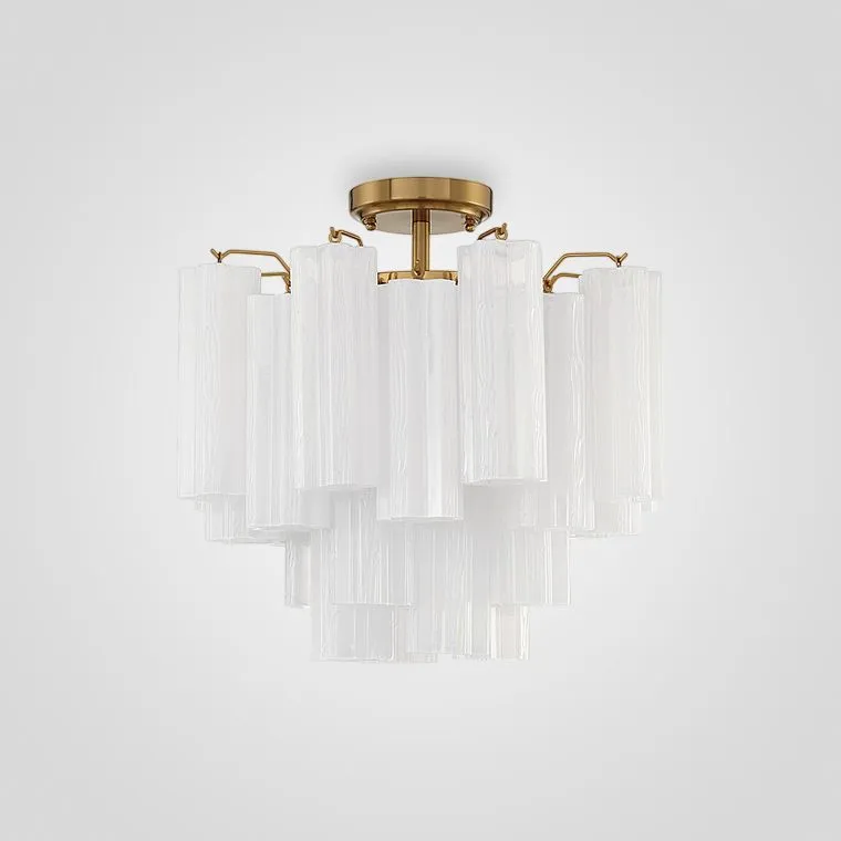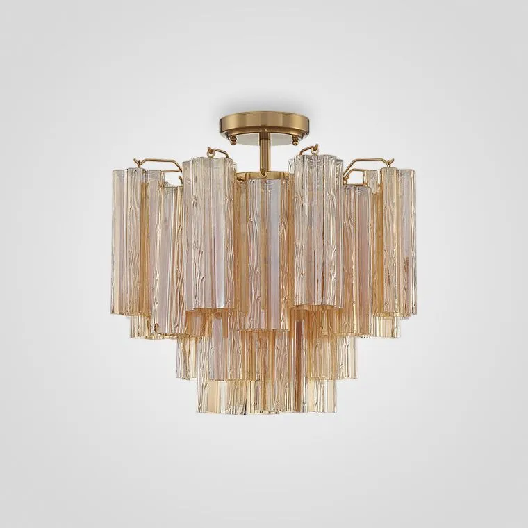 Серия потолочных люстр с трубчатыми фигурными элементами из цветного стекла, расположенными в несколько ярусов