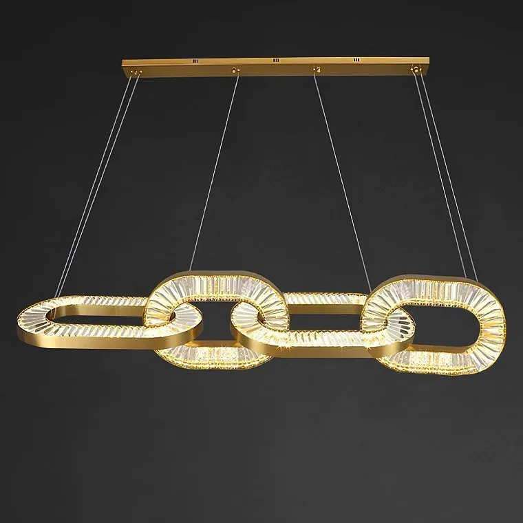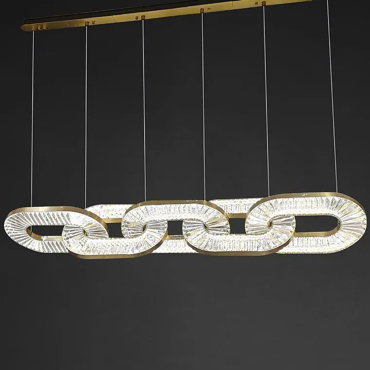 Сборка на 3, 4 или 5 колец позволяет вносить разнообразие и индивидуальность в каждое помещение. Металлические овальные каркасы, в которых словно драгоценные камни заключены хрустальные пластины, чередуются по расположению — горизонтально и вертикально. Этот гениальный дизайн создает умопомрачительный визуальный эффект, который очарует каждого, кто войдет в комнату.
