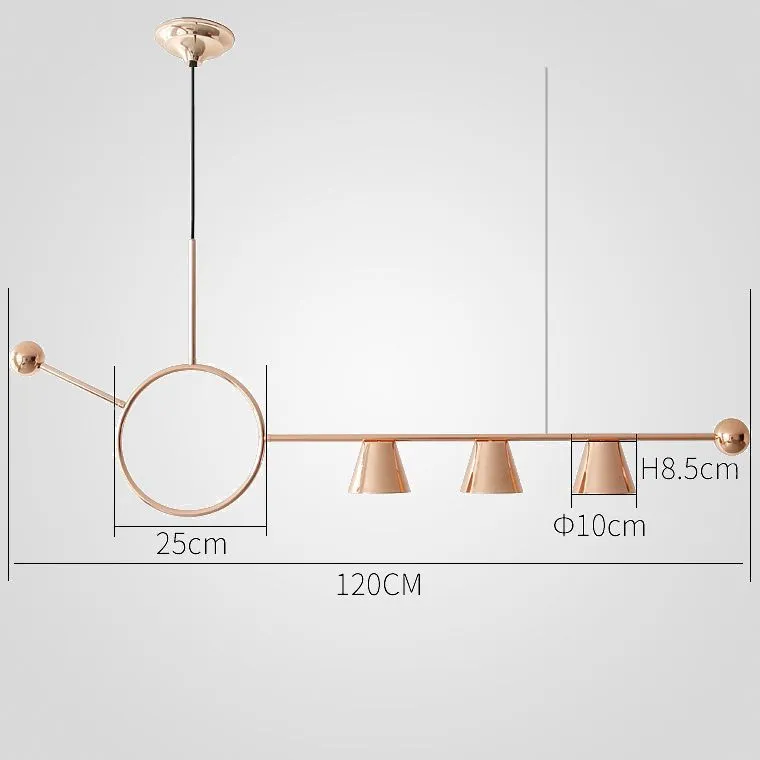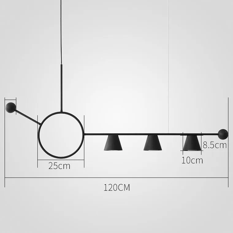 Серия рядных светодиодных светильников с конусообразными плафонами и декоративными шарами на концах.