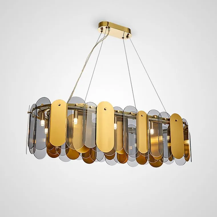 Каркас в роскошном золотом цвете в сочетании с миксом рассеивателей из серо дымчатого стекла и стильных металлических латунных пластин буквально наводит волшебство в воздухе. Рассеиватели, расположенные в два ряда, создают захватывающий эффект слоев, который выглядит гламурно и современно.