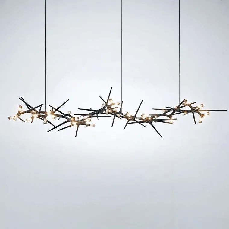 Эта роскошь воплощена в черном молекулярном корпусе, увитом хаотично расположенными стилизованными металлическими иглами. Эти иглы будто создают эффект мерцающего звездного неба, приковывая взгляды и излучая загадочный шарм. Струнный подвес добавляет светильнику легкости и элегантности.