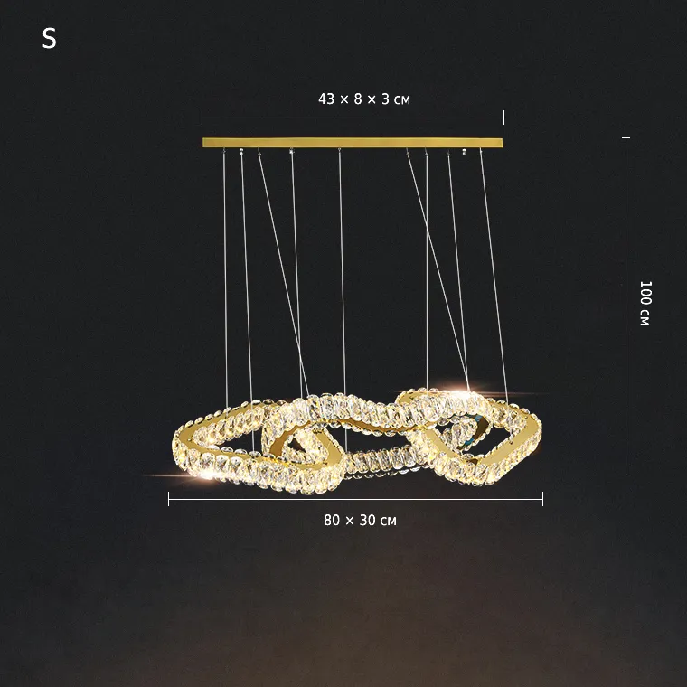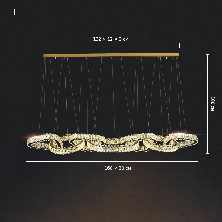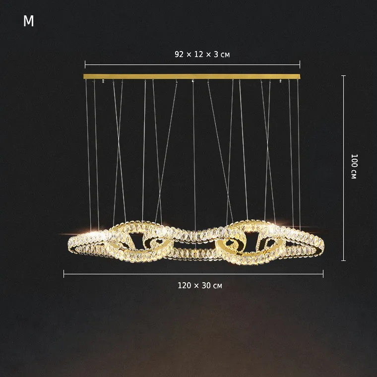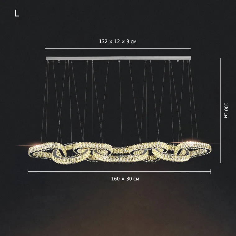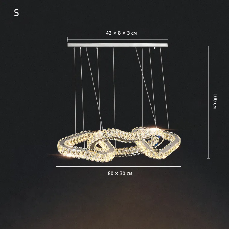 Серия рядных светодиодных люстр в виде комбинации сцепленных колец разного диаметра с хрустальными рассеивателями