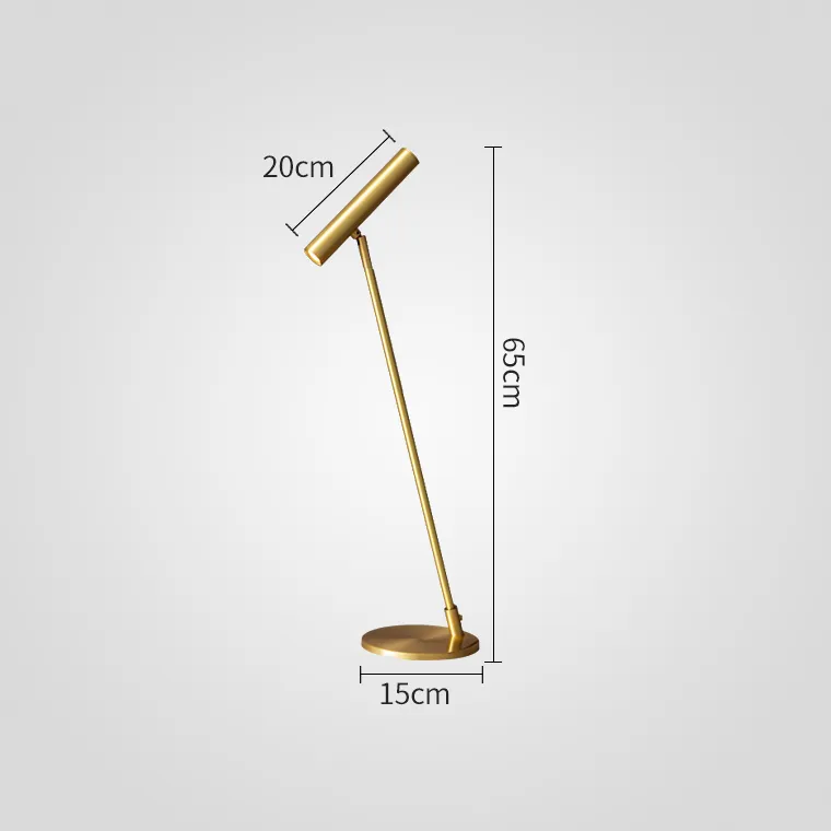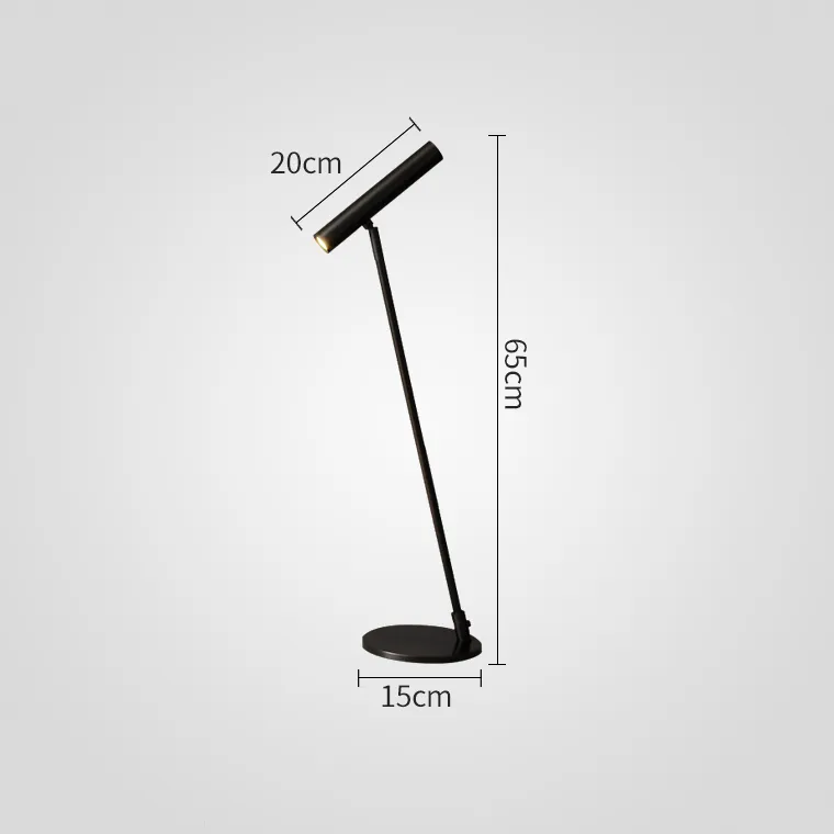Дизайнерская настольная лампа с цилиндрическим плафоном на наклоненной стойке с дисковидным основанием, в минималистичном стиле