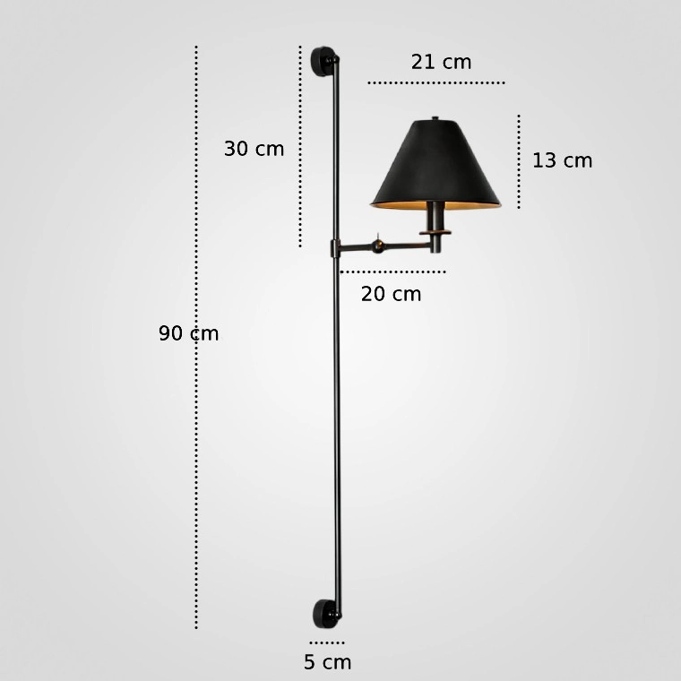 Настенный светильник с коническим металлическим абажуром на поворотном кронштейне, закрепленном на вертикальной удлиненной стойке