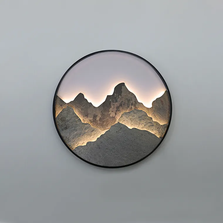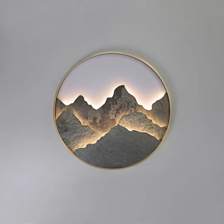 Серия настенных светодиодных светильников с каменным рельефом гор в металлической кольцевой оправе из натурального сланца