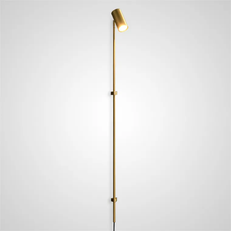 Настенный светильник с цилиндрическим поворотным спотом на вертикальной стойке из латуни с наружным подключением, через вилку в розетку.