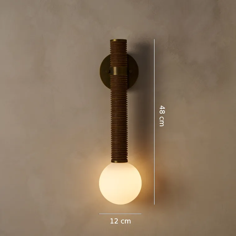 Серия настенных светильников с обтянутом кожей рельефным корпусом и белым шарообразным плафоном