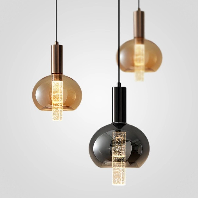 Готовая комбинация подвесных светильников с цилиндрическими плафонами из кракелированного стекла в металлических держателях