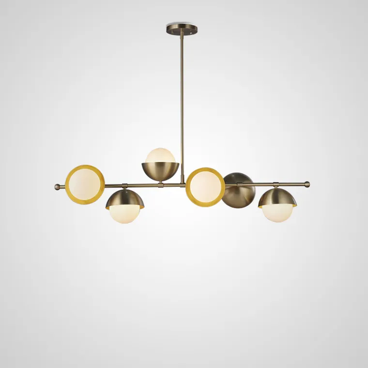В нашем ассортименте представлены два размера этого стильного и функционального светильника: Ø 35x120 см с тремя лампами G9 и 120x93 см с шестью лампами G9. Оба варианта оснащены плафонами из матового стекла, крепящимися на металлическом каркасе с покрытием под латунь.