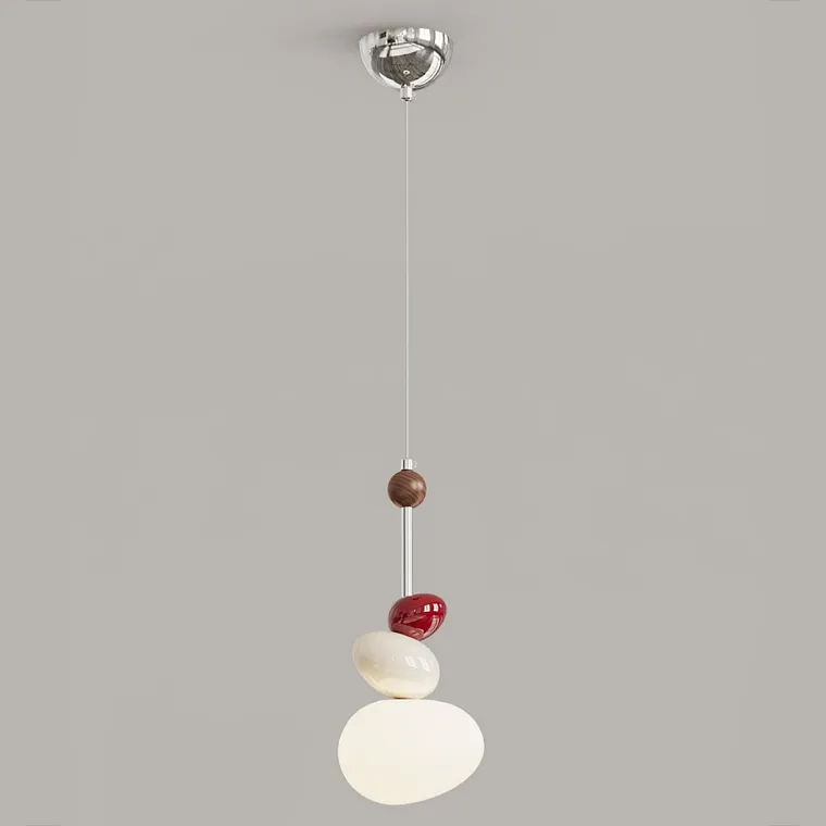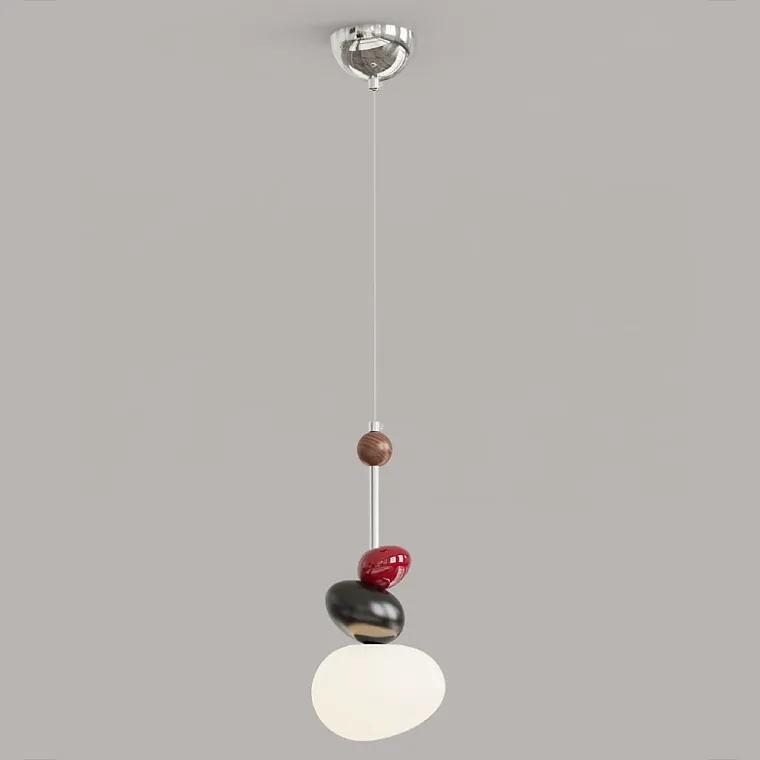 Подвесной светильник с белым овальным плафоном и декором из сложенных разноцветных «камней». Асимметричная композиция в духе современного искусства