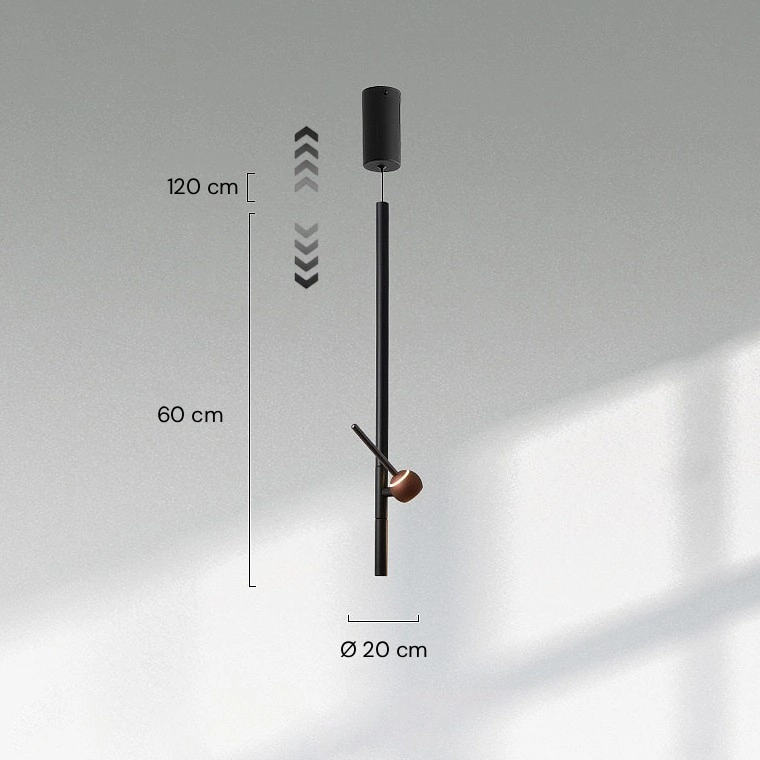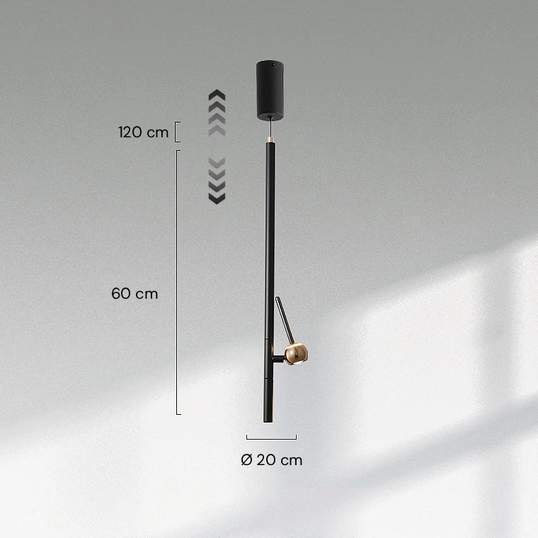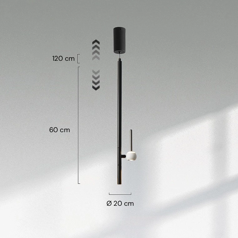 Серия минималистичных подвесных светильников с поворотным шарообразным плафоном-спотом на вертикальной штанге и с регулируемым подвесом