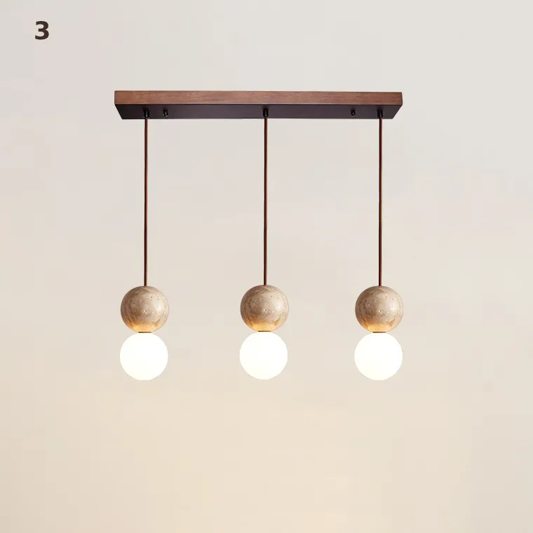Готовая комбинация подвесных светильников с шарообразными стеклянными плафонами и каменными сферами