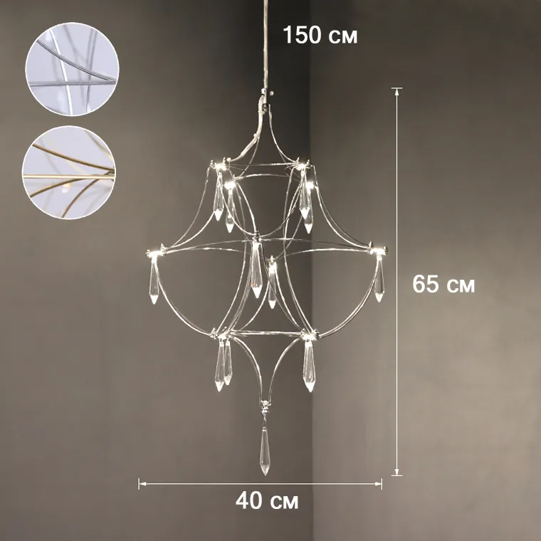 Подвесной светильник со светодиодными источниками света на ажурном металлическом каркасе с подвесками в виде хрустальных камней