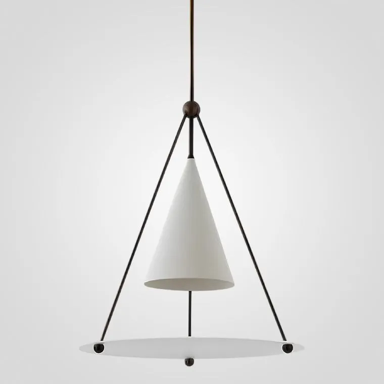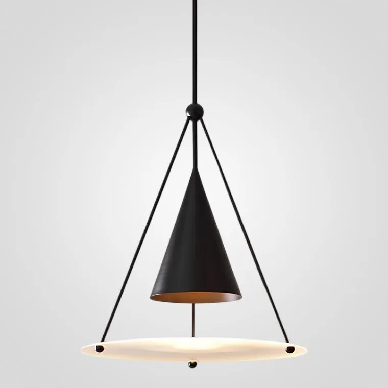 Дизайнерский подвесной светильник с коническим плафоном и дисковидным рассеивателем на призматическом основании из металла