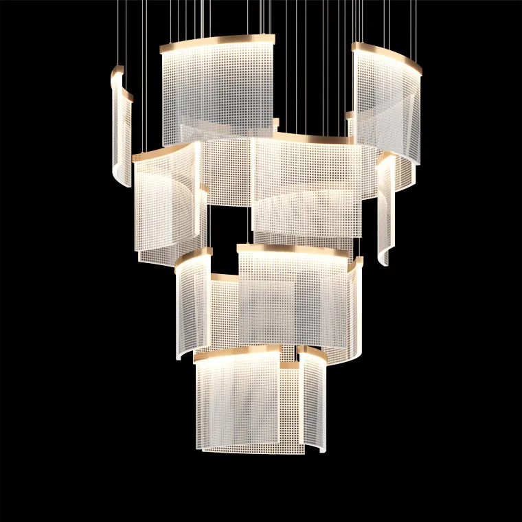 Готовая каскадная комбинация подвесных светильников с прямоугольными плафонами с точечной и сетчатой гравировкой на прозрачной поверхности