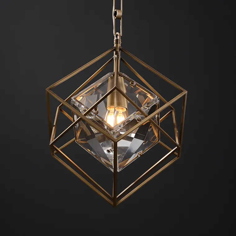 Дизайнерский подвесной светильник с хрустальным плафоном в виде кристалла внутри геометрического каркаса из металлических прутьев