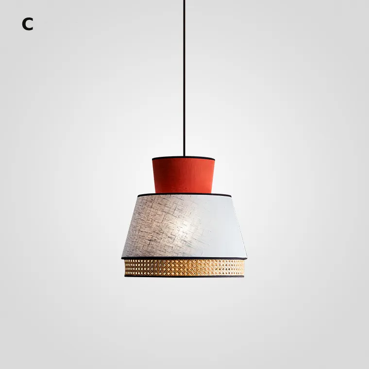 Серия подвесных светильников с рассеивателями из цветного текстиля и плетеного ротанга