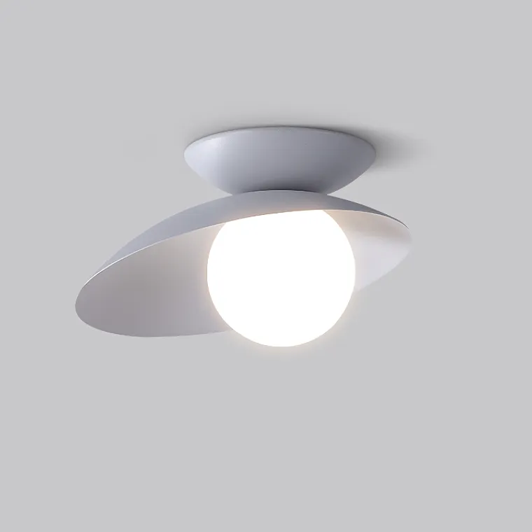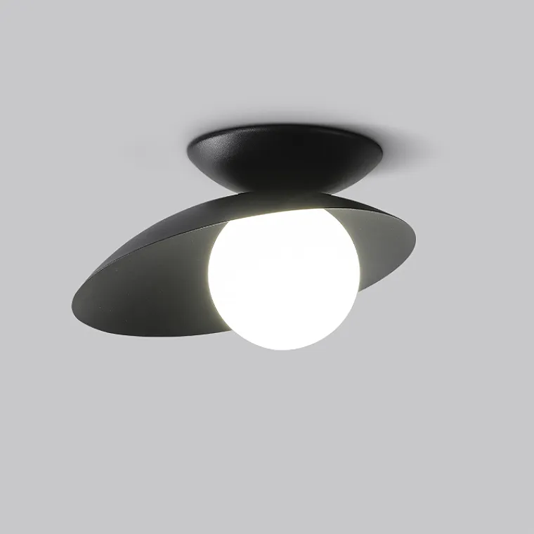 Серия потолочных светильников со стеклянным шарообразным плафоном в ассиметричном корпусе в форме диска