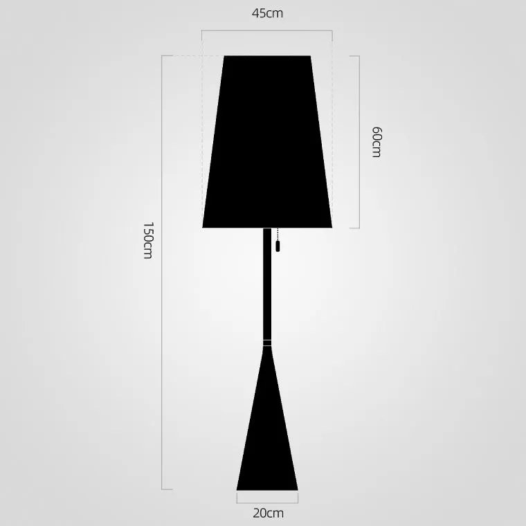 Торшер конусообразным деревянным основанием, плавно переходящим в стойку, и светлым абажуром с темной окантовкой