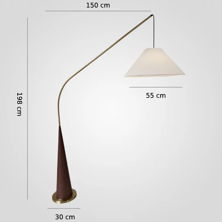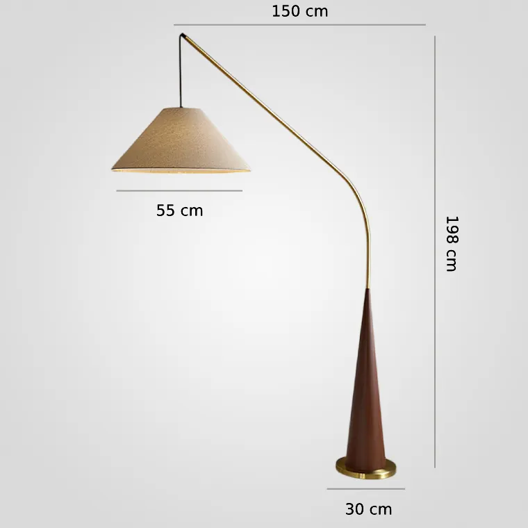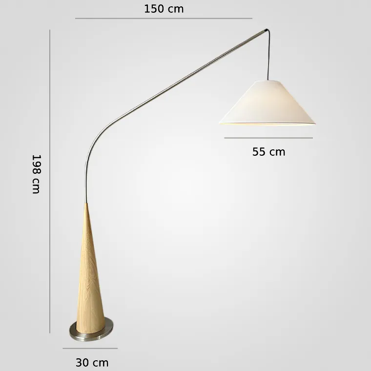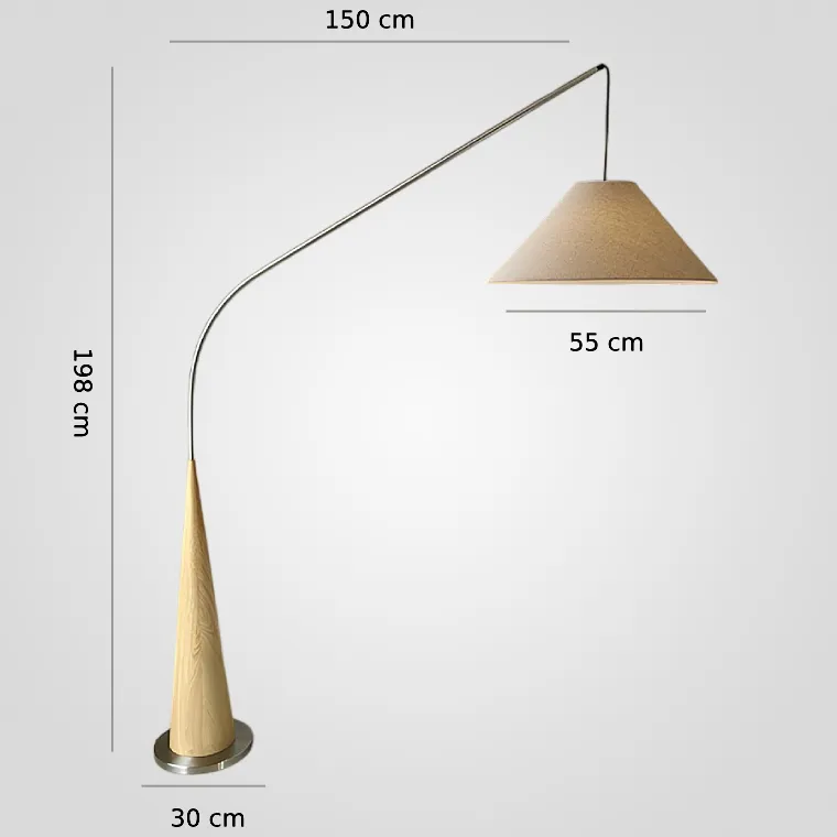 Торшер удочка с деревянным основанием конусом и изогнутым металлическим корпусом, дополненный текстильным абажуром